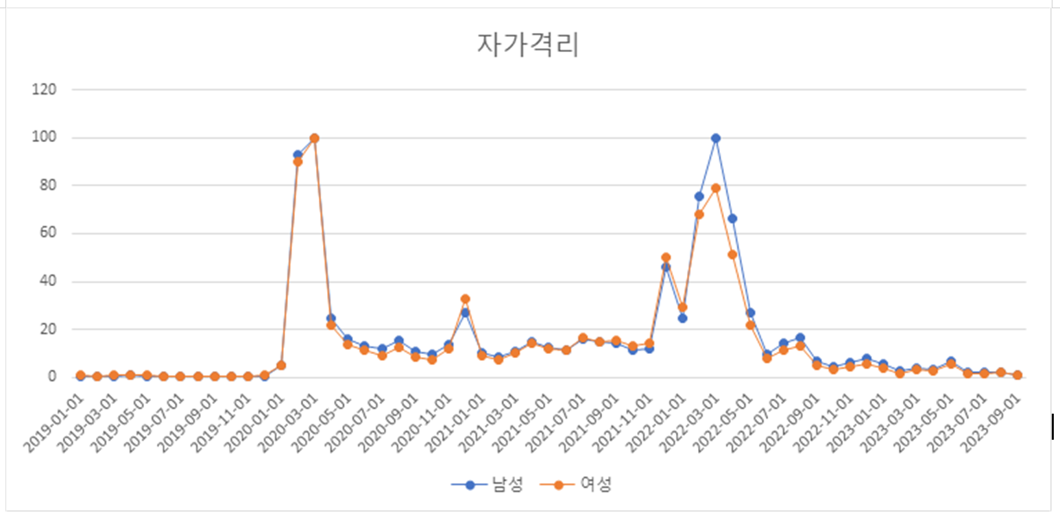 첫 환자가 202년 1월 20일 발생 시점 부로 자가격리라는 키워드가 급격히 증가하였다. 이때는 코로나의 발생으로 자가격리라는 용어가 사회에 처음 퍼졌고 정책을 국민이 이해하기 위한 시기였기 때문에 모두가 검색을 통해서 학습이 필요했던 시기였고, 한동안 감소했던 검색량은 2022년 1월 증가 하게된다 이는 자가격리의 기준이 2주에서 10주로 정책이 변경되었기 때문으로 해석된다. 이 시기에 검색량에서 남성의 검색량이 월등히 높은데 남성 직장인의 비율이 높음이 반영된 결과라 볼 수 있다. 2023년 6월 자가격리 해제를 통해서 약간의 검색량 증가가 존재하며 그이후 점점 소멸하는 것으로 볼수 있다.